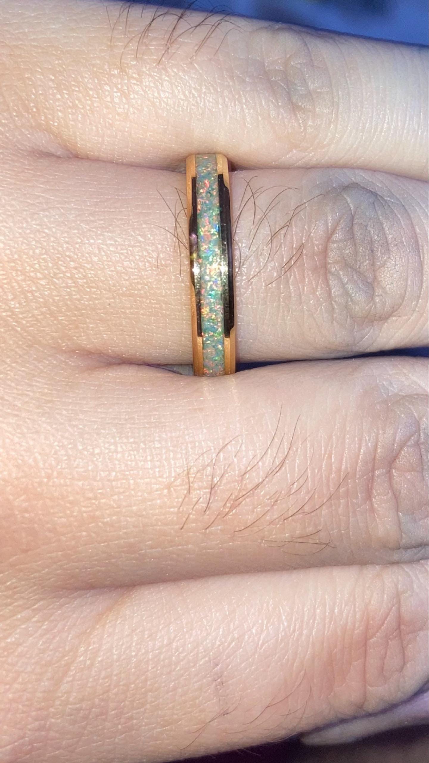 Fast shipping, ring is nice and good quality, sizing is correct and feels good, very different color than in the listing however. The pictures in the listing made it seem like it would be a uniform dark green stone in the band, but it is just regular opal with a few green flecks. A little disappointed by that, but otherwise a good item.