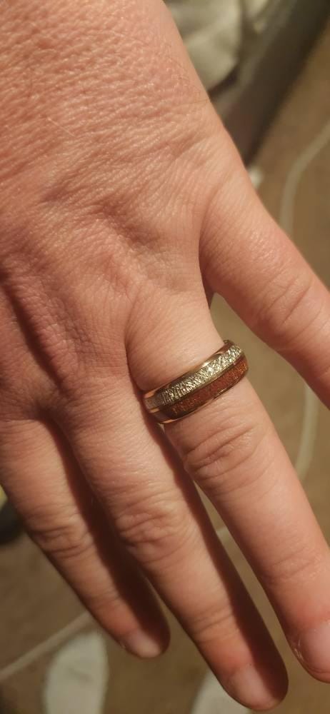 ➵ Elegant Rose Gold Tungsten Carbide Ring with Meteorite and Wood Inlay in Comfort Fit.